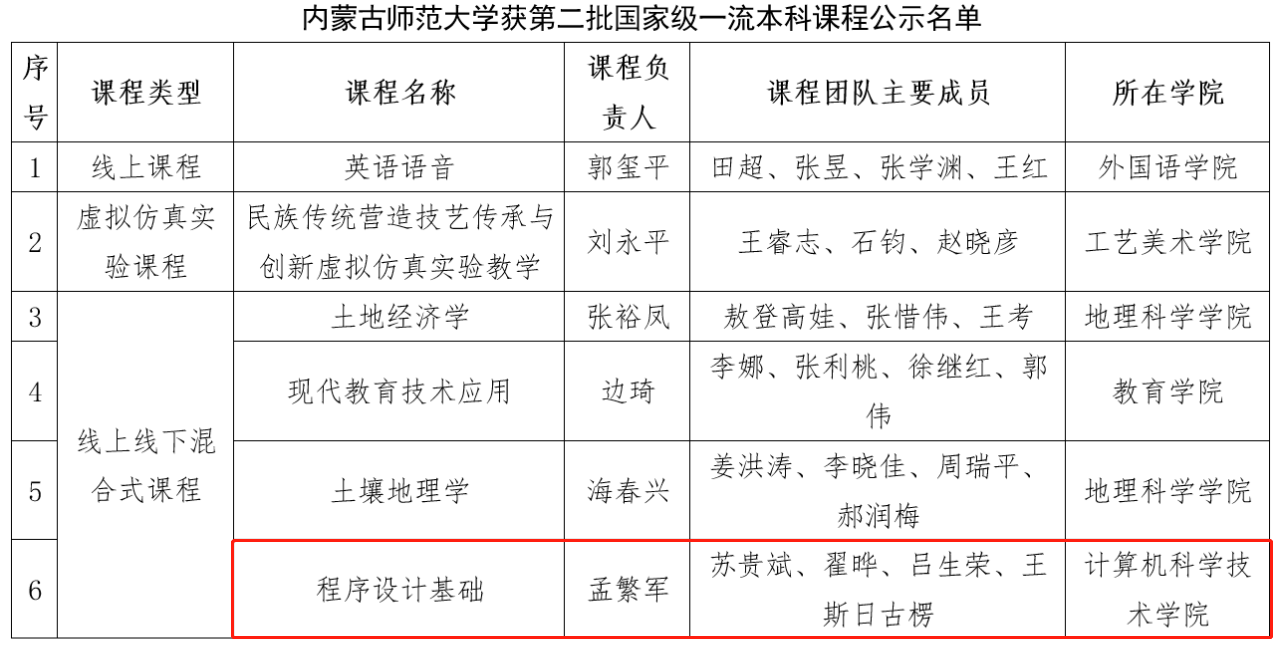 4月11日,教育部高等教育司发布了《关于第二批国家级一流本科课程认定结果的公示》,我院程序设计基础教学团队负责建设的《程序设计基础》课程名列其中,是我院被认定的第二门国家一流线上线下混合式一流课程。