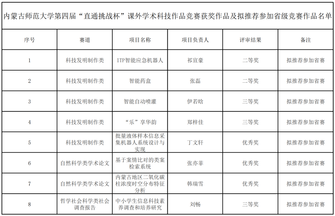为进一步引导我校青年学生努力培养科学精神和科学态度,积极学习科学知识和科学方法,提高学生创新品质和实践能力。4月8日下午永利集团304第四届“直通挑战杯”课外学术科技作品竞赛(决赛)在盛乐校区学生事务中心举行,我院,获科技发明制作类二等奖2个、三等奖2个、优秀奖1个;自然科学类学术论文类优秀奖2个;哲学社会科学类社会调查报告类三等奖,,学院荣获“优胜杯”称号。