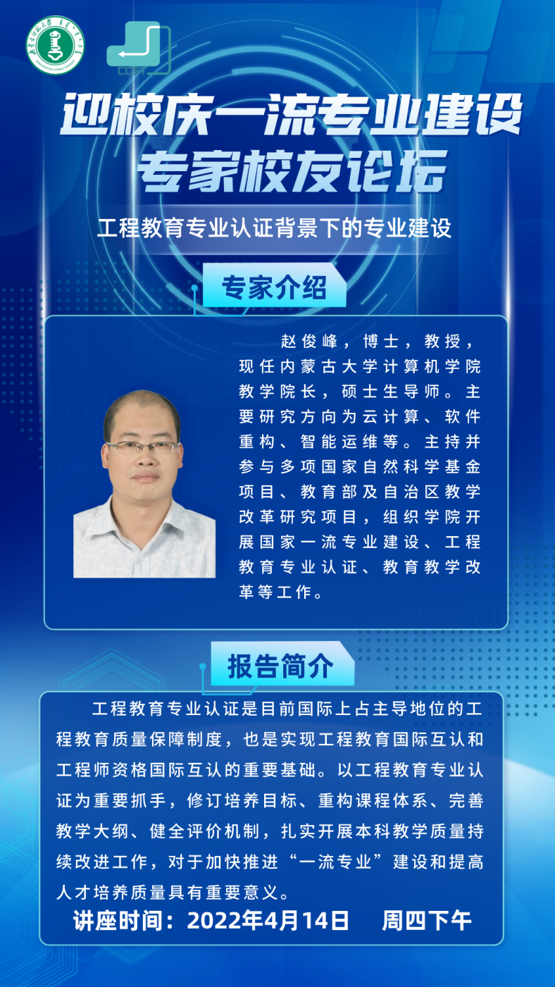 作为“迎校庆一流专业建设专家校友论坛”系列活动内容之一,4月14日,永利yl304邀请2000届优秀毕业生赵俊峰校友为全院教职工开展了专业建设专题讲座。赵俊峰教授现任内蒙古大学计算机学院教学院长、硕士生导师。本次讲座采用线上会议的形式展开,由院长林民教授主持,报告主题为“工程教育专业认证背景下的专业建设”。