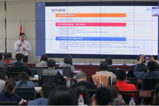 本次讲座特邀复旦大学计算机学院邱锡鹏教授做题为《自然语言处理中的自注意力模型》的学术报告,邱锡鹏教授首先对自然语言处理的表示以及常用的模型进行了介绍,然后介绍自注意力模型的原理,并分析自注意力模型的基本原理和优缺点,提出一些改进模型(Star-Transformer、Multi-Scale Transformer、BP-Transformer等),随后介绍了自注意力模型在文本分类、实体名识别等任务上的具体应用并对自注意力模型及其未来发展趋势进行展望。最后,邱锡鹏教授与我院师生开展学术交流。