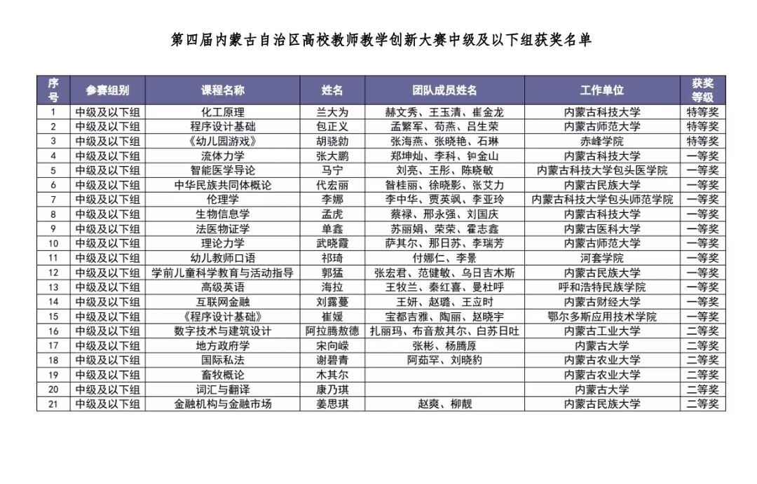 本次大赛以“推动教学创新,培养一流人才”为主题,比赛内容主要包括课堂教学实录视频、教学创新成果报告、教学设计创新汇报等三个方面。经网络和现场评审,由我院包正义老师担任主讲教师,孟繁军、苟燕、吕生荣老师担任成员的团队荣获中级以下组特等奖,将代表自治区参加国赛。
