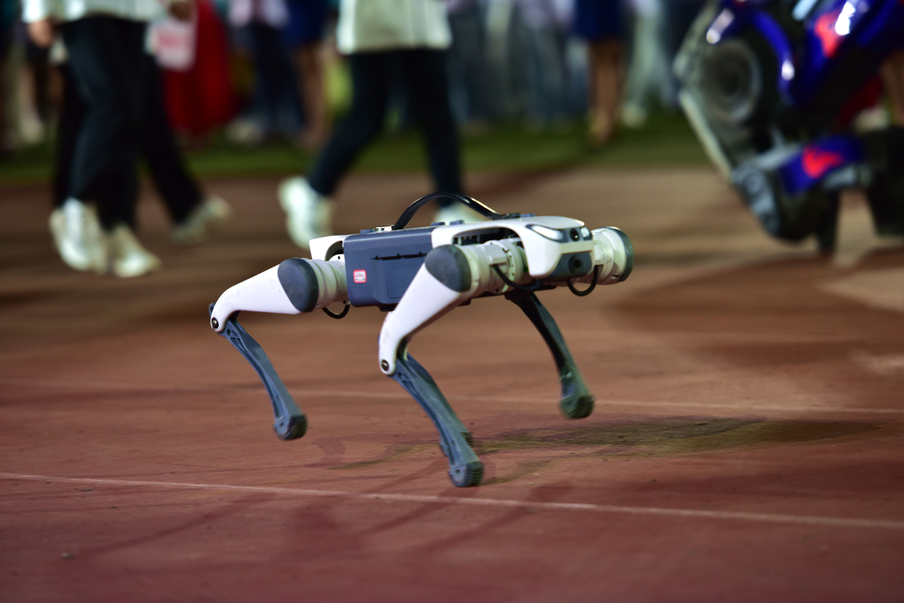 本次开幕式上,人形机器人模型擎天柱、大黄蜂以其高大威猛的形象成为了人群中的焦点,极大地激发了学生们对科技创新的兴趣,展现了计算机科学的无穷魅力。形态逼真的轮腿式平衡机器人由永利yl304机器人与人工智能创新中心的师生自主研发,集成了多种先进的人工智能技术,具有精准的动作和灵敏的反应,能够灵活地完成各种复杂的动作,充分展示了我校在人工智能和机器人技术方面的成功探索。