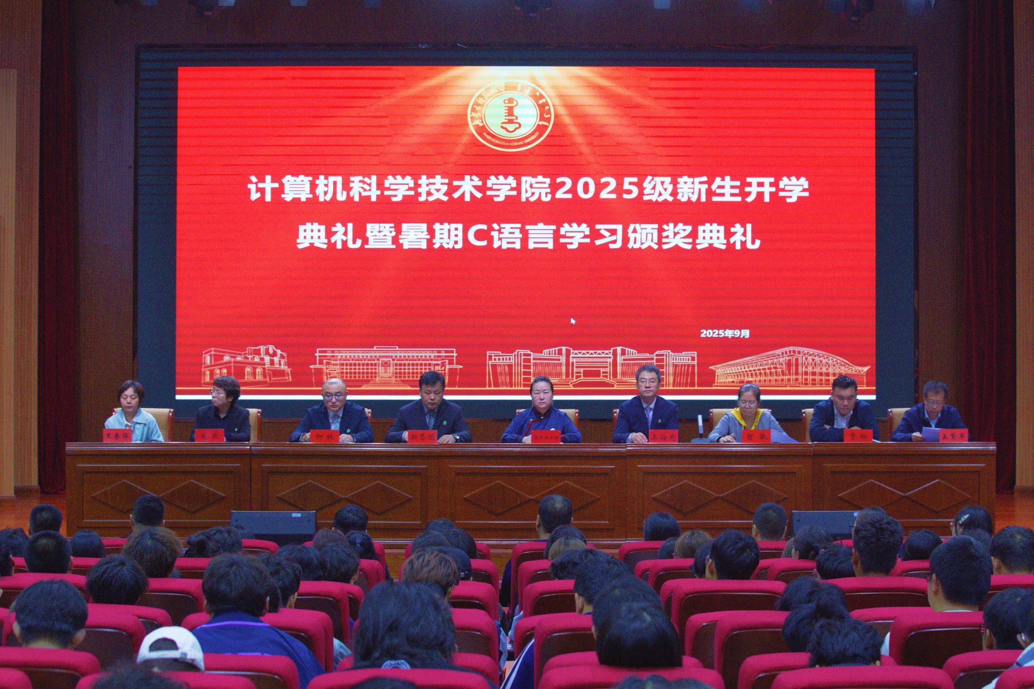 9月27日,永利yl304举行2025级本科生开学典礼暨暑期C语言学习颁奖典礼在盛乐校区图书馆报告厅举行,共迎358名2025级本科新生。学院党委书记乌日其木格,院长王海龙,副院长斯琴图、智敏、柳林、贾阳出席开学典礼,各系部负责人、辅导员、新生班主任参加开学典礼,典礼由副院长柳林主持。