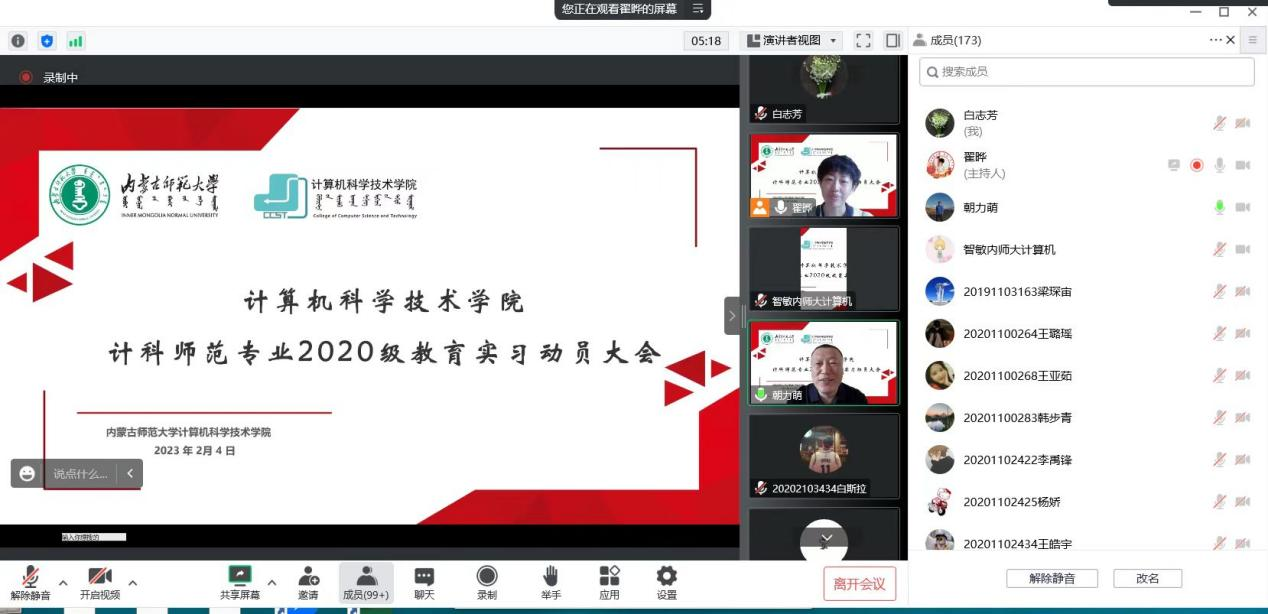 2023年2月4日上午,我院以线上腾讯会议的方式召开了2020级计科师范专业教育实习动员大会。学院院长林民、副院长智敏、计算机系系主任朝力萌、副主任翟晔、副主任王春晖、教育实习指导老师和辅导员参加了会议。