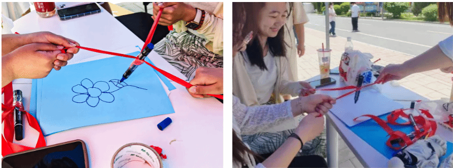 除了心理知识的宣传讲解,活动现场还准备了一场破冰小游戏 —— “神笔马良”。游戏需要三人一组,将三条短绳绑在一根记号笔上,通过团队成员的默契配合,在纸上共同完成一幅画作。