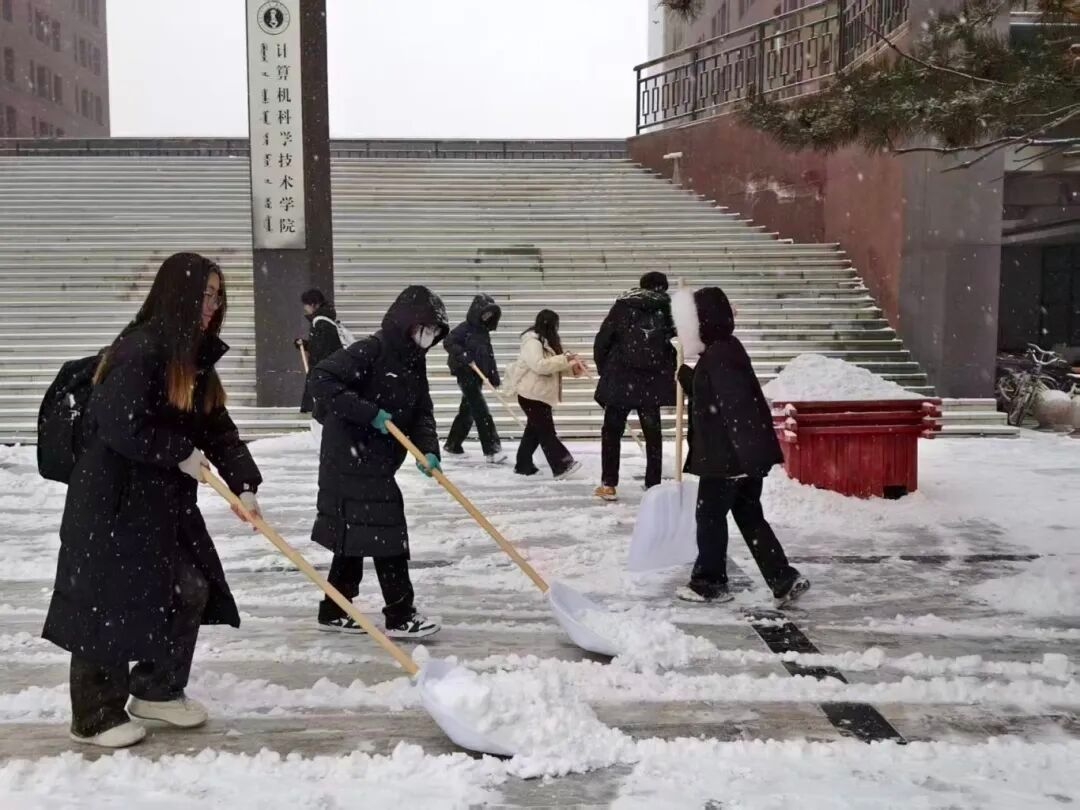 虽然气温较低,寒风凛冽,但同学们不畏严寒,干劲十足。志愿者们手持铁锹、扫帚等工具,对学院楼前、教学楼周边以及宿舍区主干道的积雪进行了集中清理。大家分工协作,配合默契,铲雪、推雪、清扫……一个个忙碌的身影在雪地中构成了一道温暖的风景线。劳动过程中,同学们团结互助,展现了昂扬的劳动热情和积极的精神风貌。